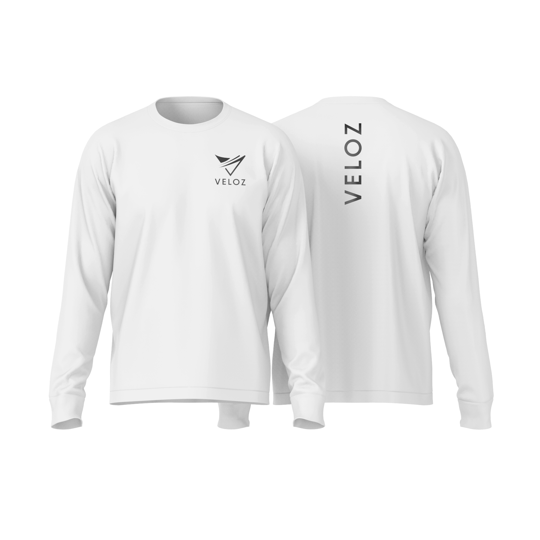 Veloz athletic dry-fit long sleeve shirt in white, with black Veloz logo on front and back. Polyester mini-pique fabric is breathable, moisture-wicking and machine washable.